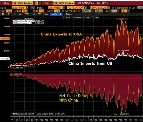 China’s trade surplus with the Rest Of The World was north of US$1 trillion for the first 11 months of 2025.