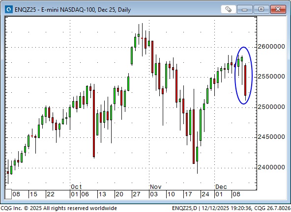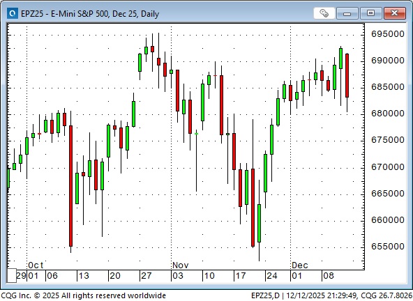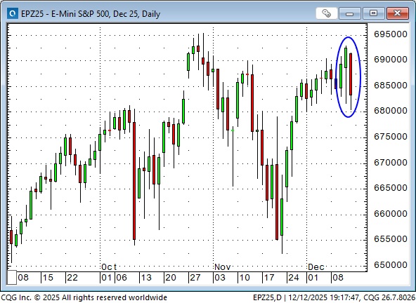 The S&P surged on Wednesday and Thursday after the not-so-hawkish (?) cut from the Fed, nearly making a new record high, but slipped lower overnight Thursday and tumbled on Friday as traders seemed to have “second thoughts” about AI.