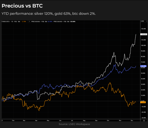 Bitcoin has been struggling lately, down ~36% from October’s record highs, and flat YTD, while gold and silver have soared.