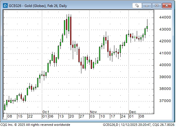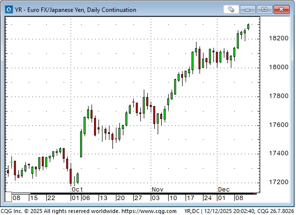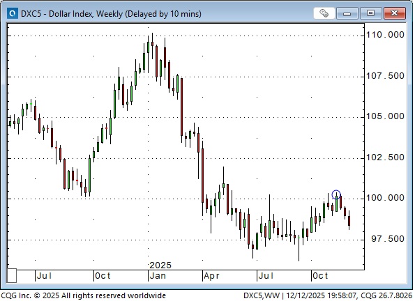 The DXY US Dollar index closed above 100 in mid-November for the first time in six months, but couldn’t sustain the gains. FX markets appear to embrace the notion that a shrinking US interest rate premium relative to other currencies implies a lower US dollar. (And for that flimsy reason, traders are willing to buy the Euro and GBP against the mighty USD?)