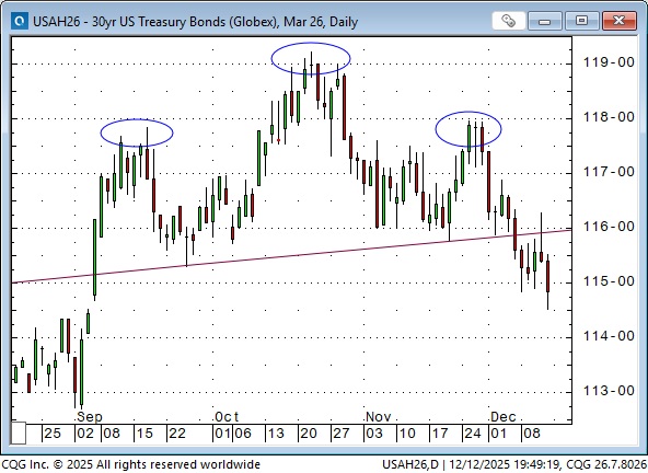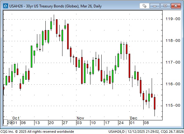 The long bond has been trending lower since mid-October (could it be that the bond market doesn’t like that 3% is the new 2%?). Please tell me that the bond market is too sophisticated to fall for the old “Head and Shoulders” chart pattern (which would point to a target of ~112).