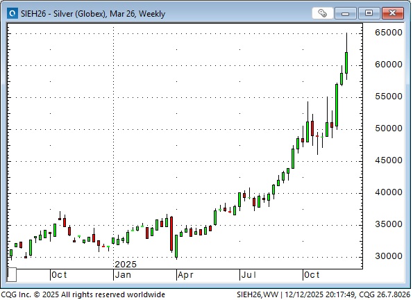 Silver has been the “wild child” of the metals markets, with the Comex front month (March 2026) reaching $65 early Friday morning (before correcting $4 per oz in three hours), for a gain of ~116% from the April lows.