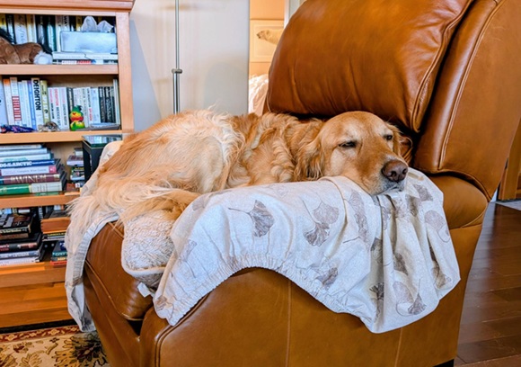 Barney was happy to see me after “Papa” had been away for four days. We got back into our routine on Monday morning, taking our first walk of the day as the sun peaked over the horizon. Here he is now, waiting patiently for another walk after I finish writing the Notes.