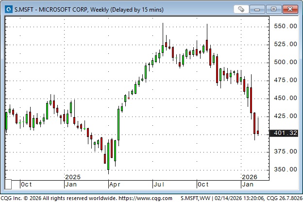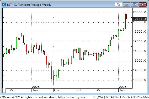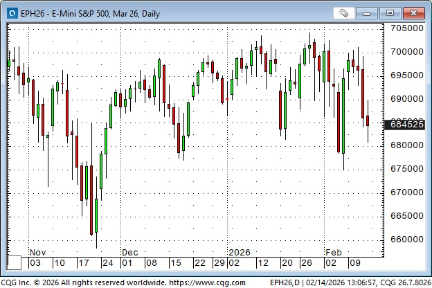S&P futures have chopped sideways within a 200-point range since November. They traded to a record high above 7000 on January 28 (the day gold and silver had record high closes), but subsequent rallies have reversed lower.