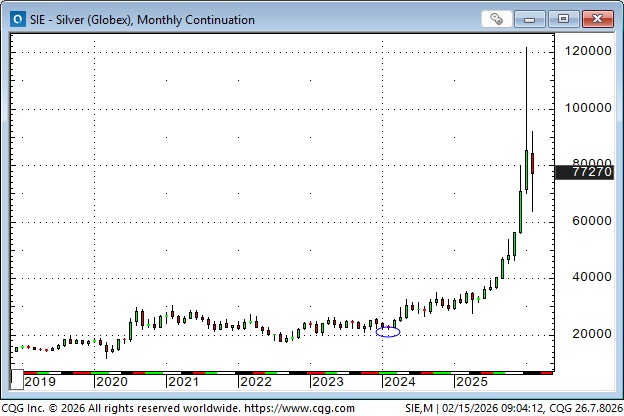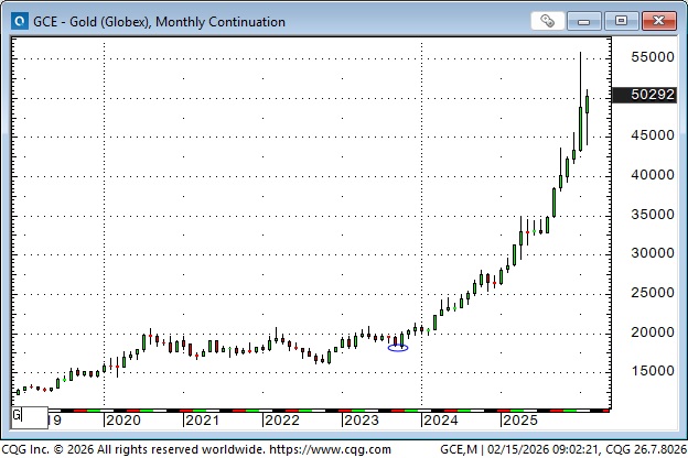 Having a solid bid under the market emboldened speculators, and gold prices soared. The “debasement trade” (governments are destroying the purchasing power of fiat currencies with relentless fiscal deficits) provided an excellent rationale for extending the rally, and the uptrend went parabolic, with Comex futures rising above $5,580 in January, up ~$3,775 from the October 2023 lows made before the Hamas attack on Israel.