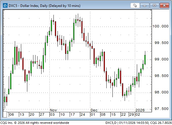 The DXY US Dollar Index has rallied ~2% from the Christmastime lows. Mark Farrington, a veteran FX analyst, expects a stronger USD in 2026 as massive US IPO issuance, the “Monroe Doctrine” policies, rising US defence spending and energy dominance continue to draw capital to the USA.
