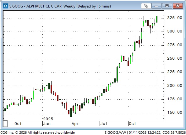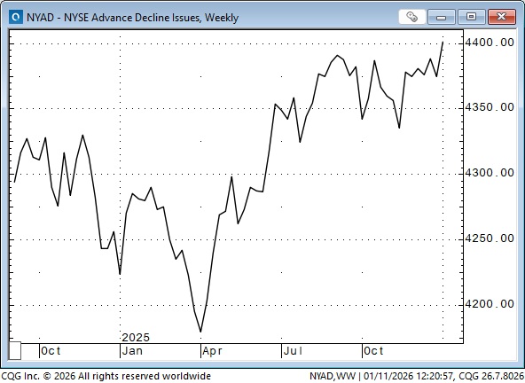The NYSE A/D ratio closed at a record high, as capital is rotating out of some tech stocks into other market sectors. (AAPL is down ~10% from December’s record highs, MSFT and NVDA are down ~12% from their highs, while GOOG closed at record highs, up ~132% from the April lows.)
