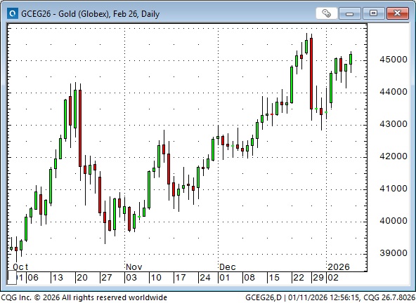 Comex February gold reached a record high of ~$4,585 on December 26, fell ~$300 to the December 31 lows, and recovered most of that decline by Friday’s close.