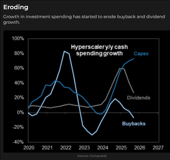 Corporate buybacks have frequently been described as one of the most potent bullish forces powering the equity market rally. Will massive capex spending reduce the amount of capital available for buybacks and dividends, or will companies borrow to pay shareholders?