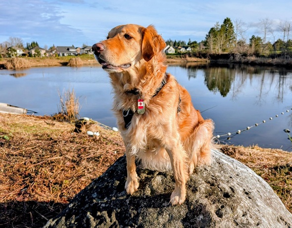 It’s the rainy season here in the Pacific Northwest rain forest, so when there is a lovely sunny break in the weather, Barney and I like to get out and soak it up. He loves to climb up on things, in this case, a boulder near the golf course irrigation pond, to get a better look around. He turned four years old in September, but there’s still a lot of puppy in him, and I don’t mind that at all.