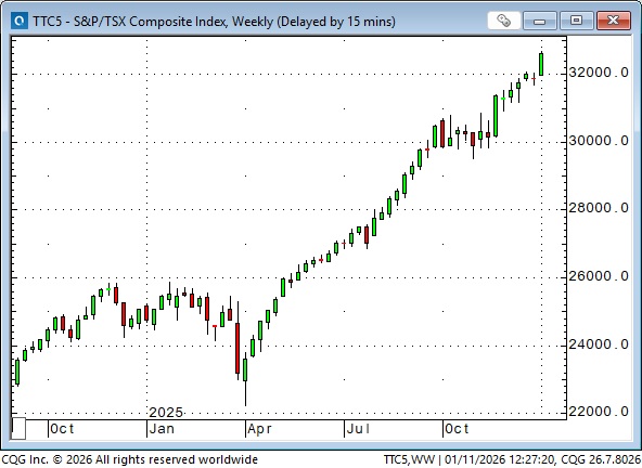 The Toronto Composite Index surged to new highs this week, up ~47% from the April lows.