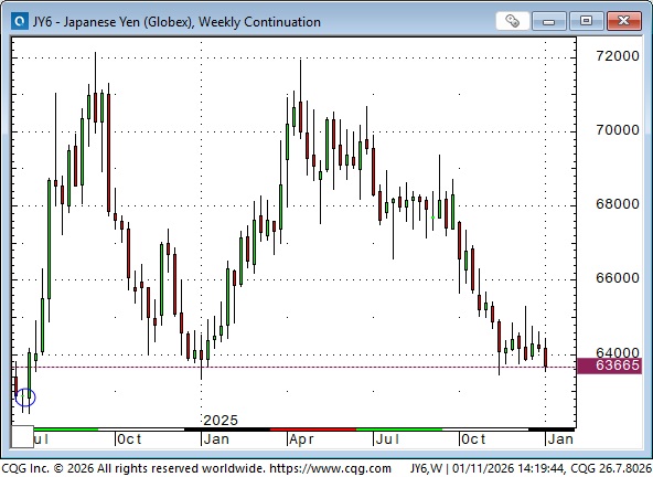 The front-month Yen futures contract closed at its lowest weekly level since July 2024 (blue ellipse in the lower-left corner of the chart) just before aggressive intervention by Japanese authorities ignited a short-covering rally that lifted the Yen by ~16% over 10 weeks. Rising tensions between China and Japan (including China restricting rare earth exports to Japan) may be weighing on the Yen.
