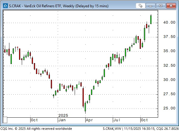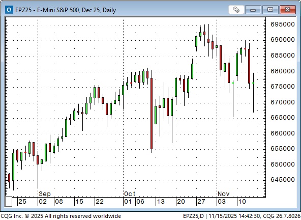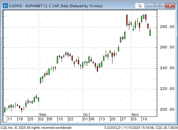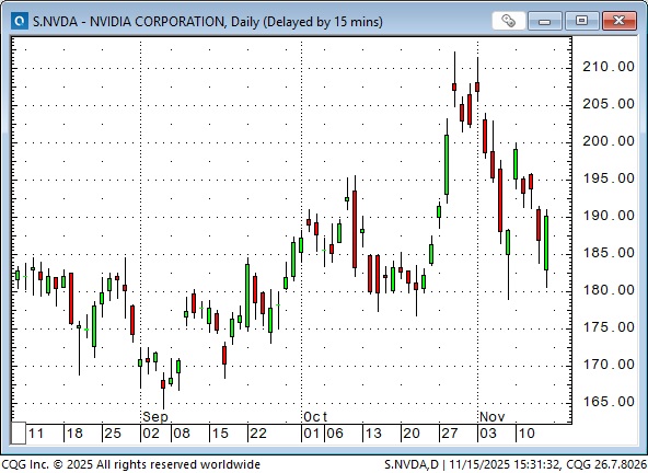 NVDA’s quarterly report is due on Wednesday, November 19. My cynicism says it will beat expectations (don’t they all?), but the market bulls need a “leading light” right now, and a surging NVDA would make a great “Rudolf” for a Santa rally into year-end.