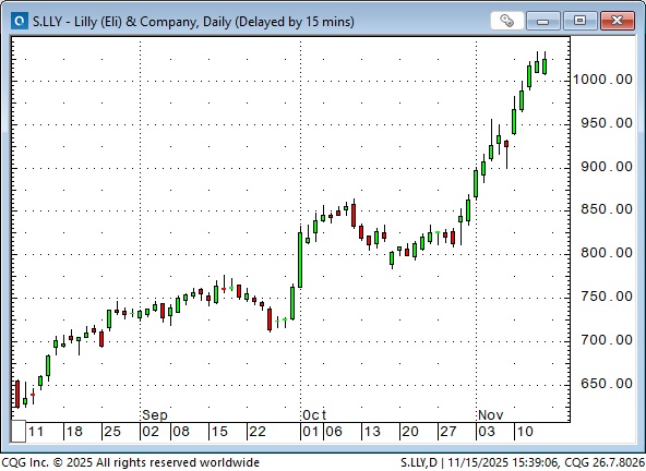 While skepticism about AI is weighing on the tech sector, the healthcare sector is “doing fine,” with some issues adding buoyancy by losing weight. LLY is up ~66% from the April lows.