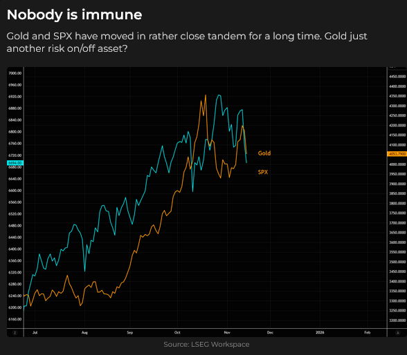 I actively trade S&P futures and use them as my “leading barometer” of risk sentiment. I also watch how price action in the S&P correlates with other assets. For instance, as gold rallied ~$1,000 from August to October, I think it “transitioned” from being primarily a “debasement hedge” to being just another risk asset for speculators to chase higher.