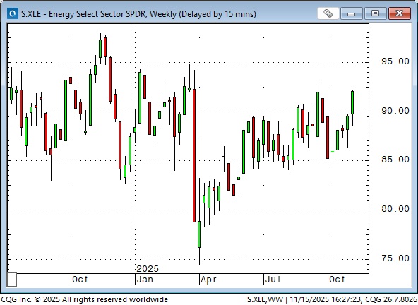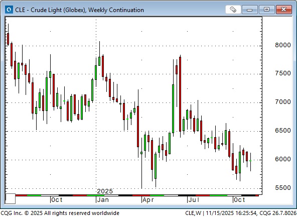 Nymex front-month crude oil spiked in response to the Israel-Iran confrontation this summer, but has been under pressure since then as current (and early 2026) supply appears to be greater than demand.