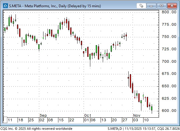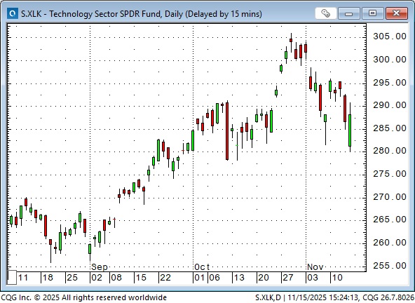 The overall tech sector surged higher in late October on the AI story, but fell back by ~8% as sentiment turned skeptical.